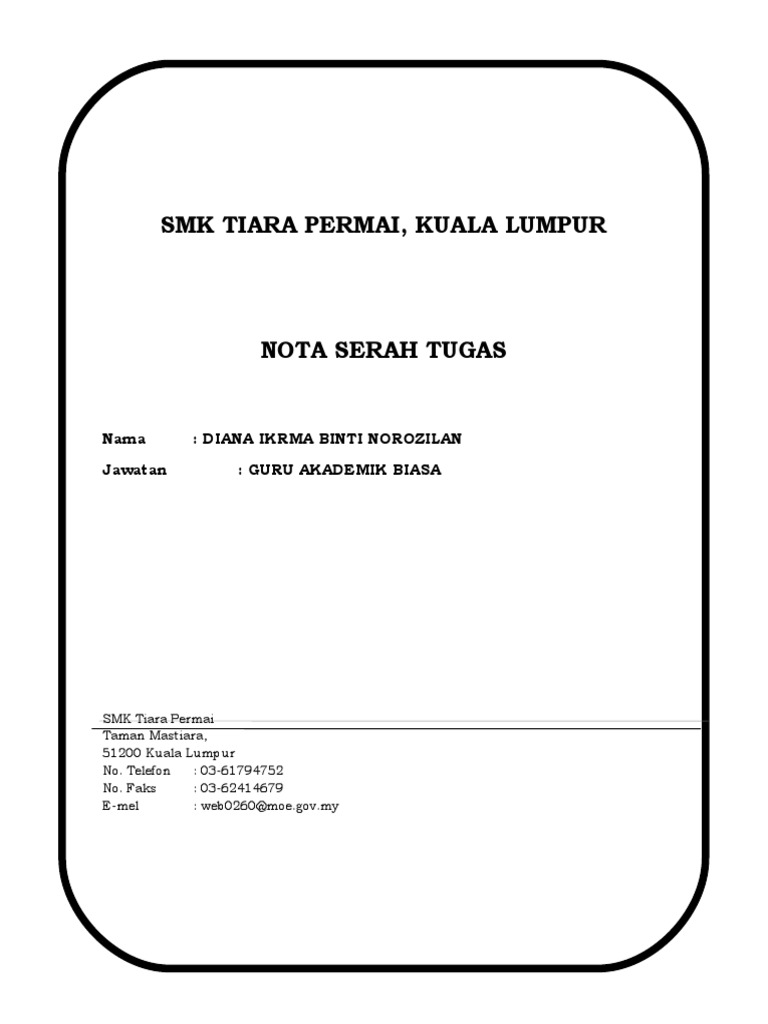 Contoh Nota Serah Tugas Pembantu Tadbir Kewangan from i1.wp.com Pertukaran merupakan salah satu fungsi pengurusan sumber manusia. Bagi seorang guru yang berpindah sudah pastilah wajib membuat nota serah tugas ini, supaya segala tanggungjawab yang dipikul sebelum ini dapat diamanahkan. Namun, tugas dan tanggung jawab bendahara sebenarnya tidak sesederhana mengatur keuangan saja. Keberadaanya diminati para kicaumania, terbukti hampir setiap rumah kicau mania terdapat burung kecil ini. Kekuatan kampus kejuruteraan adalah semangat kekeluargaan dan kerjasama yang tinggi dan ini. Nota serah tugas ini juga merupakan arahan oleh jabatan perkhidmatan awam bagi penjawat awam yang berpindah atau bertukar. Di rumah adhi hanya ada seorang pembantu yang sudah tua yang bertugas sebagai tukang masak dan mencuci. Kebiasaannya, selepas sahaja lulus pertukaran, perkara pertama yang perlu difikirkan oleh guru adalah menyediakan nota serah tugas.