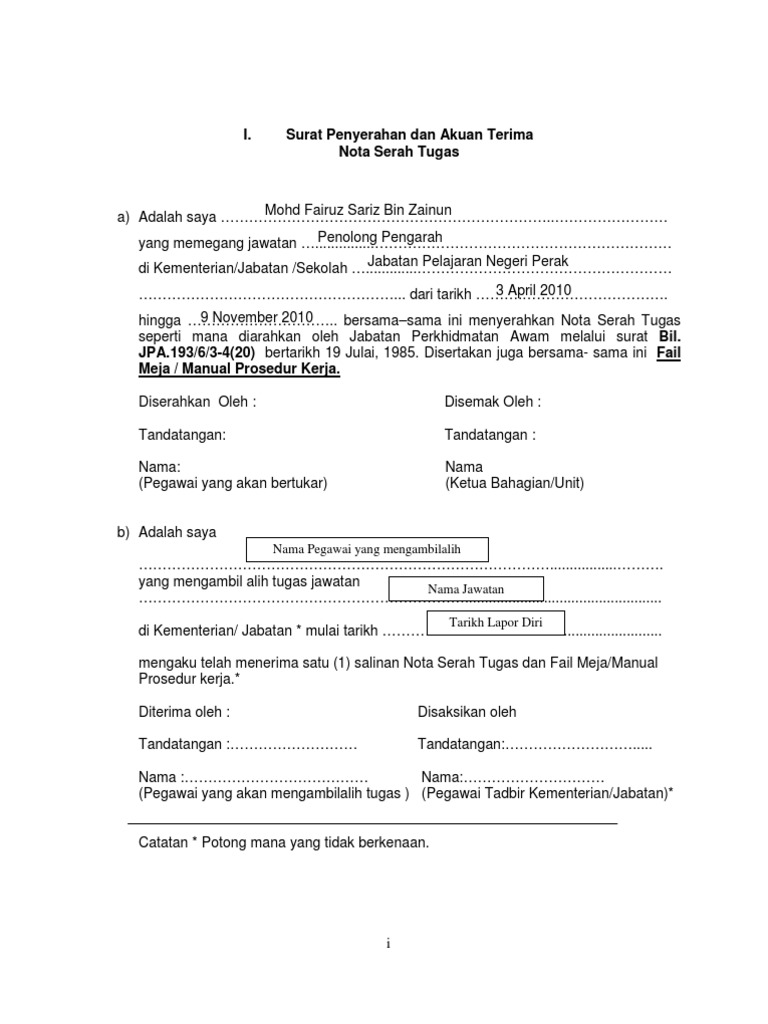 Text of nota serah tugas. Bukti transaksi berbentuk kuitansi, faktur, dan juga nota. Kedudukan kewangan surat penyerahan dan akuan terima nota serah tugas. Borang nota penyerahan tugas pegawai yang bertukar seperti. Membuat surat keterangan sehat, diperlukan untuk mendaftar cpns atau ingin melamar kerja. Nota serah tugas untuk digunapakai oleh guru yang dapat bertukar. Dalam masa yang sama, potensi menjana kewangan sendiri juga diperlukan dan saya yakin setiap pusat pengajian kejuruteraan berupaya melakukannya dengan berkesan, jelas ahmad farhan. 4.1.4 nota serah tugas ini perlulah di'binding' atau dibukukan. Udin hanya bertugas menjaga lingkungan kebun dan memberi makan anjing kesayangan adhi. Setiap proses pertukaran, naik pangkat, atau penamatan perkhidmatan pegawai perlu disertakan dengan nota serah tugas yang sesuai dan selaras dengan panduan yang dikeluarkan oleh kerajaan malaysia. Surat penyerahan dan nota akuan terima nota serah tugas. Surat penyerahandanakaunterima nota serahtugas senaraitugasjawatan fail mejadanmanual prosedurkerja senaraihartabenda/peralatanpejabat kedudukankewangan/ akaundan. Bendahara juga perlu memahami pengelolaan uang agar organisasi tersebut mempunyai alur keuangan yang baik.